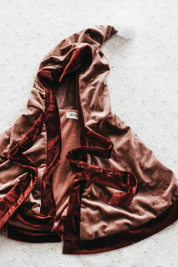 The Christmas Cape is made in matching velvet fabric, featuring a velvet tie at the front and pompom on the hood. The perfect accessory to finish off your Christmas outfit.