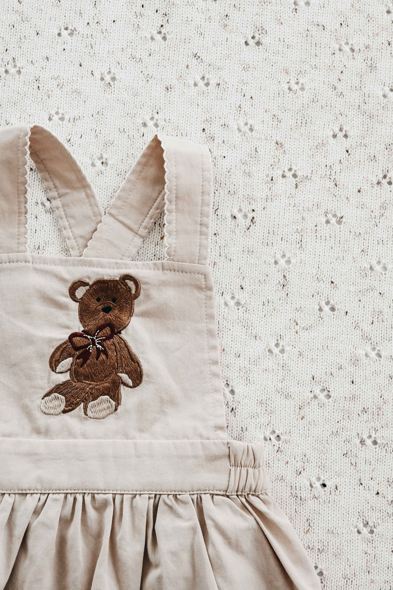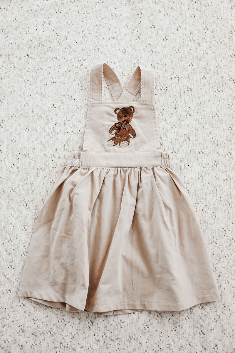 This dress is made from a woven cotton fabric, featuring an embroidered Peshal Christmas Bear on the front.