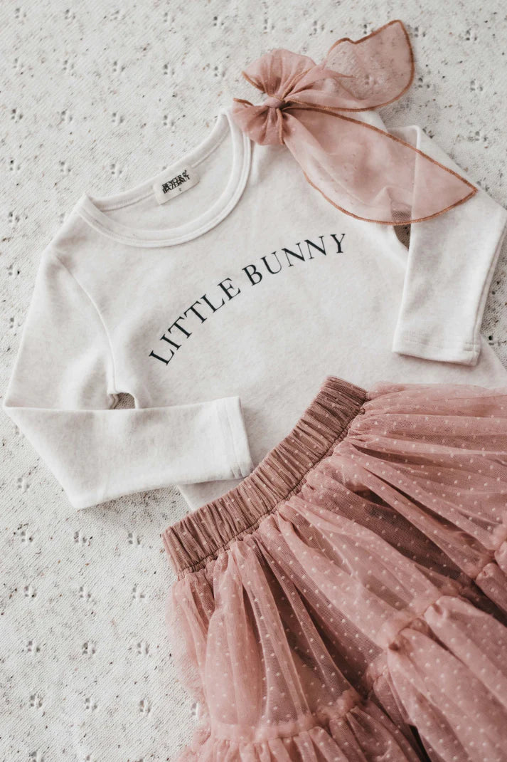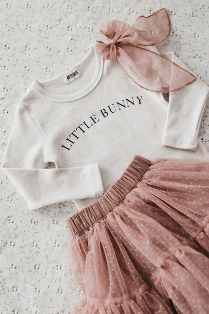 Made from a speckled tulle fabric, featuring a tiered skirt and elastic waistband.